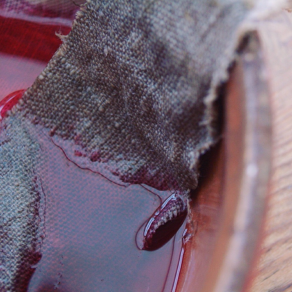 In a pan bring them to the boil then turn off the heat, squidge them with a potato masher to get all the juice out then leave to cool. Sieve the dye into a bowl, now rinse your chosen fabric with water so it’s soft and wet (I feel it takes up the colour better this way) and then submerge it in the dye. I usually go off and forget about it for a couple of hours.