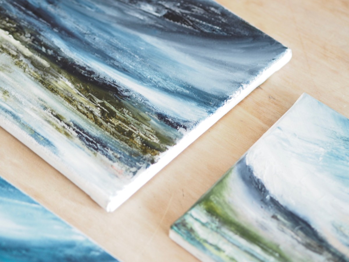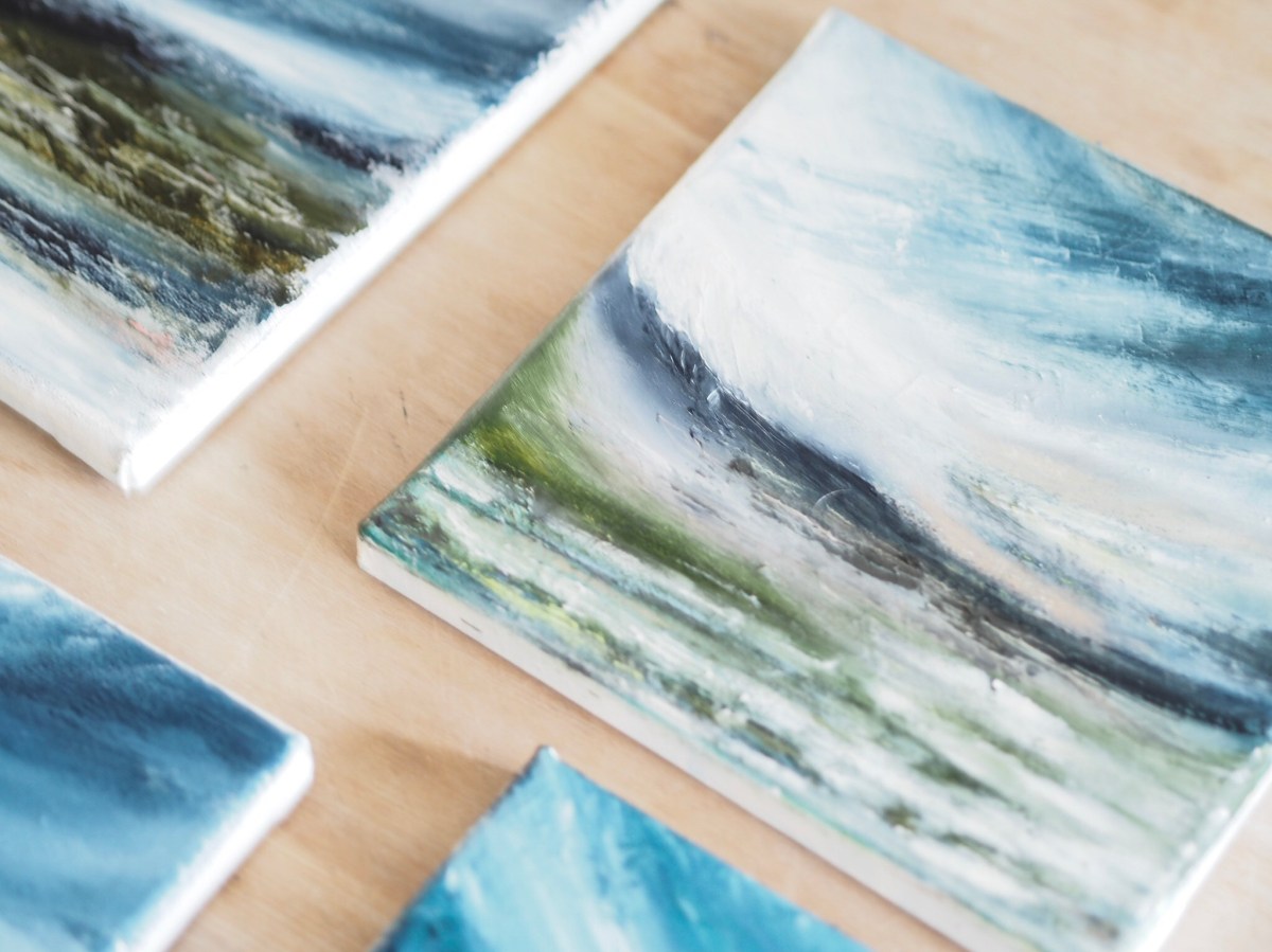 This week has seen a dramatic change in the seasons, the blossom came out and the storm raged through. It made my paintings quite moody and textures with dashes of light shot through. So I thought I’d just share a few pics from this week, as it’s been all about the blossom and the painting, two of my favourite things!