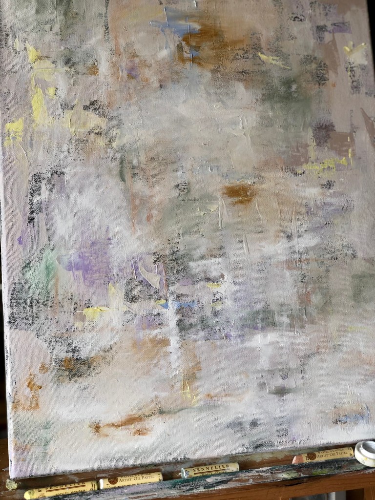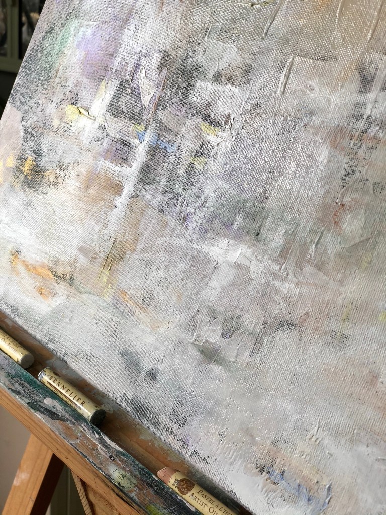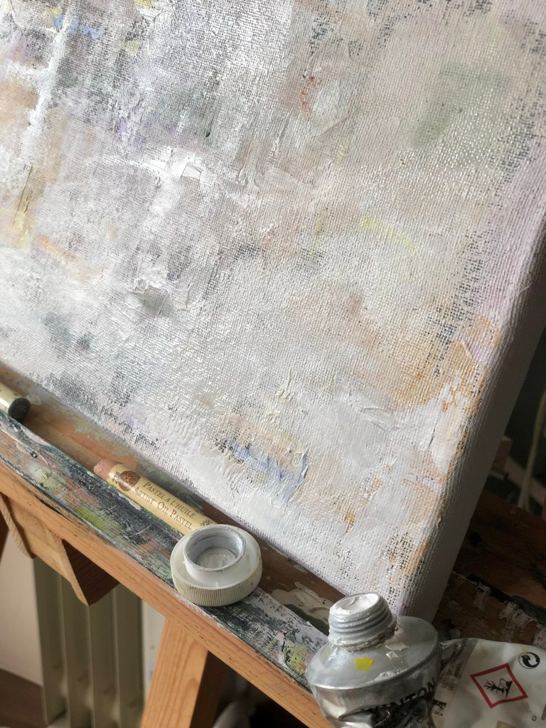 The base is acrylic with patches of emulsion. Then I’ve blended a white oil over the top with some linseed oil and finished off with my favourite oil pastels by Sennelier.